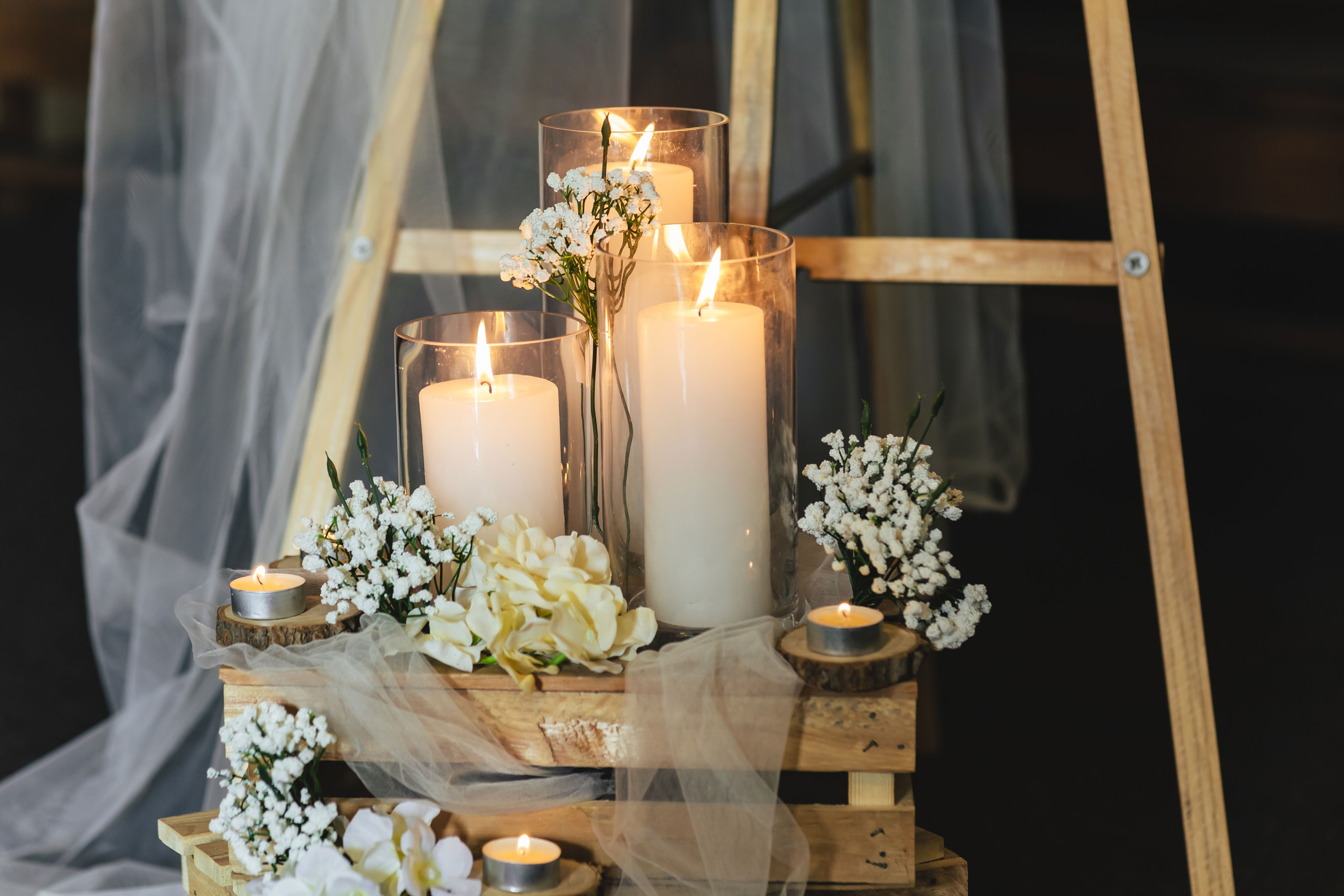 A romantic ceremony may include soft candlelight, handwritten vows, personal readings, and a soft pastel colour palette.
